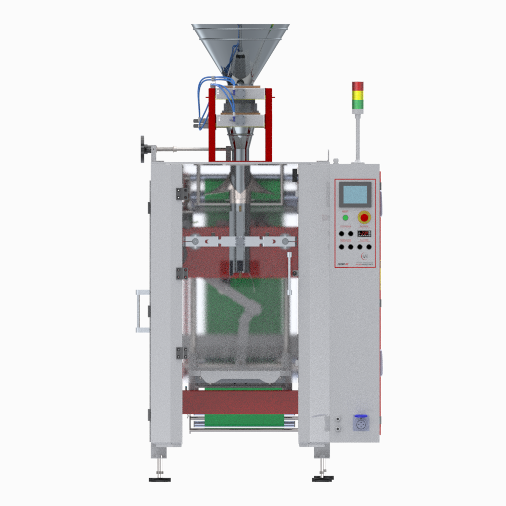 As empacotadeiras verticais são responsáveis por acondicionar os produtos à granel em pacotes de diferentes tamanhos. Sua aplicação se dá através do tracionamento de um filme plástico que é soldado horizontalmente e verticalmente para a formação do pacote requisitado.